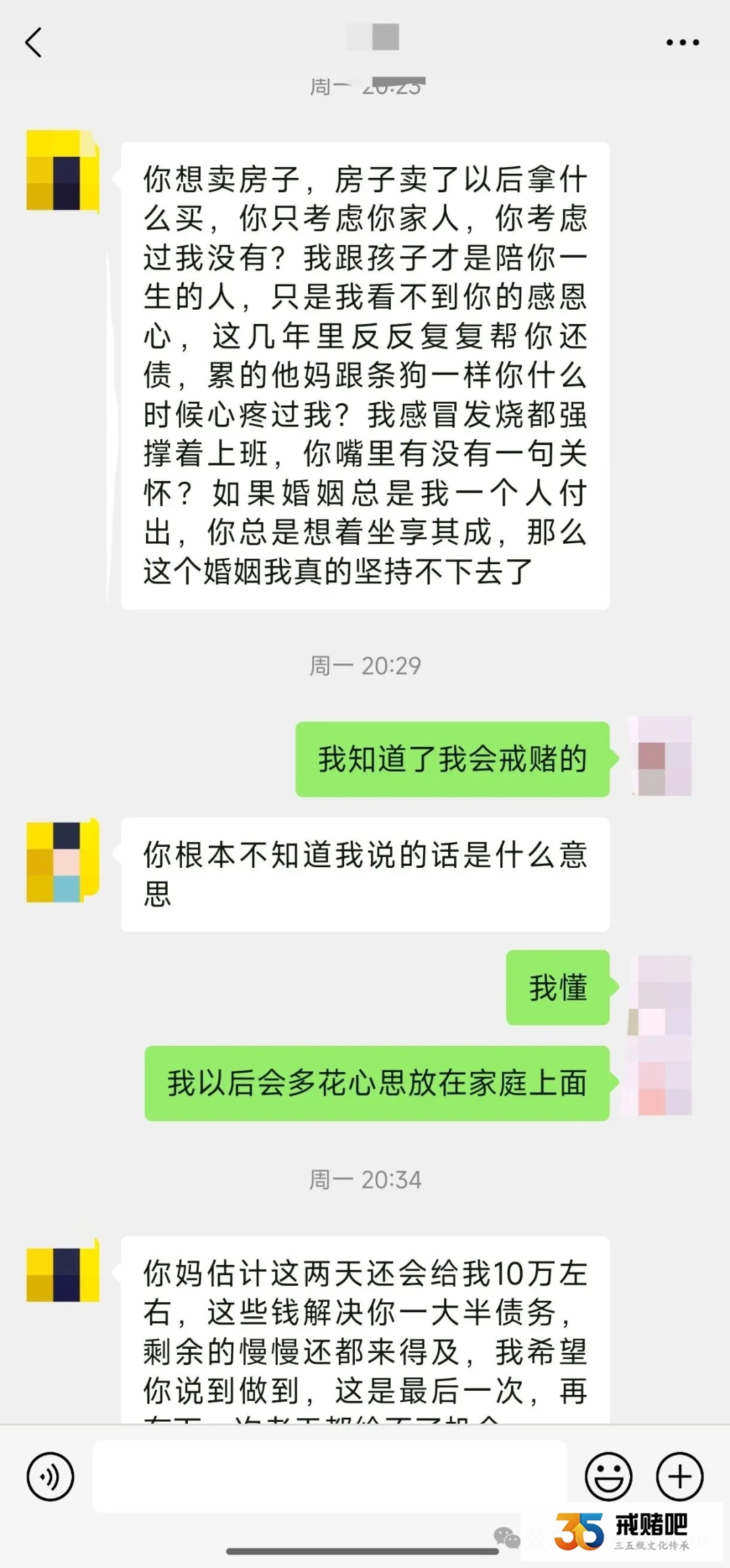 我的问题是戒赌,我相信只要戒赌了债务肯定能还上。因为爸妈那边能凑26万,还剩20万差不多两年时间就能还上,那时候我还是可以过上正常人的生活,而且也能保住房子,所以我一定要珍惜这次机会了。...